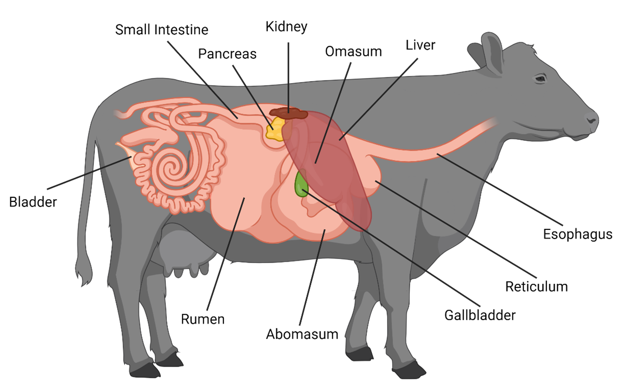 Ruminants includes cattle, sheep, goats, and deer etc. They are unique among animals for their ability to efficiently digest complex plant materials that monogastric animals (like pigs or humans) cannot. This ability comes from their specialized digestive system, which includes four compartments: the rumen, reticulum, omasum, and abomasum. Each compartment is specialised for its function including the large surface area to improve digestive efficiency and the presence of rumen microbes that enhance the digestion process.