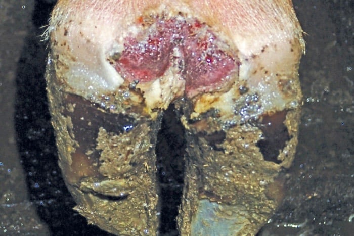 It occurs more frequently in wet, muddy, or manure-laden conditions that soften the skin and allow bacteria to penetrate.