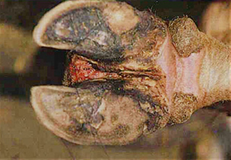 Treatment: Corrective trimming to relieve pressure; applying hoof blocks to unaffected claws; topical treatments to prevent infection.